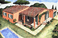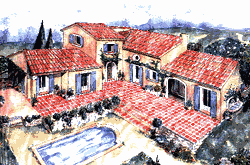 La poutre de bois rond, les têtes de piliers, sa treille nous rappellent la petite maison de nos bergers dans les collines, à l'abri des regards indiscrets.
